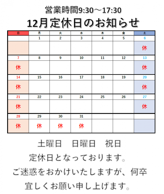 いつも当店をご利用いただきありがとうございます。 当店11月の定休日は以下画像の通りとなります