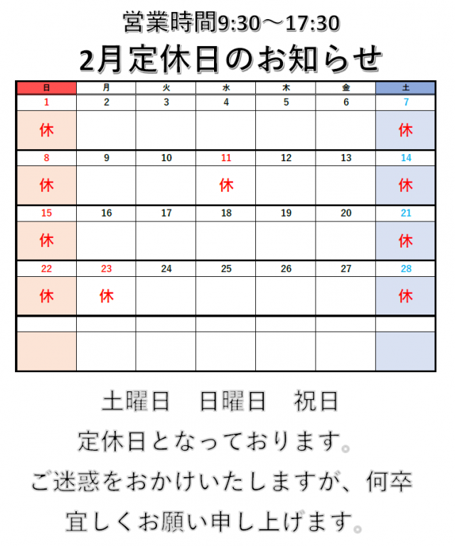 いつも当店をご利用いただきありがとうございます。 当店2月の定休日は以下画像の通りとなります