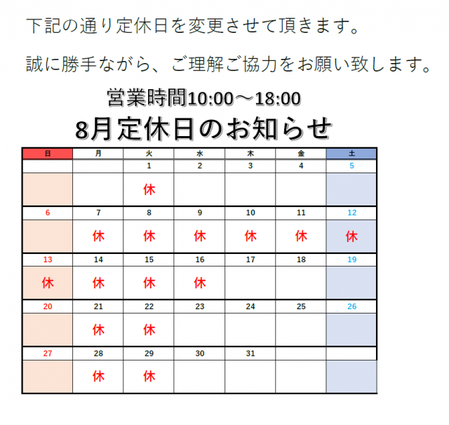 8月定休日のお知らせ いつも当店をご利用いただきありがとうございます。 当店7月の定休日は以下画像の通りとなります。 また、7月よりにて全面禁煙となります。 ご不便をおかけいたしますが、ご協力をお願い申し上げます。 2023.08.02