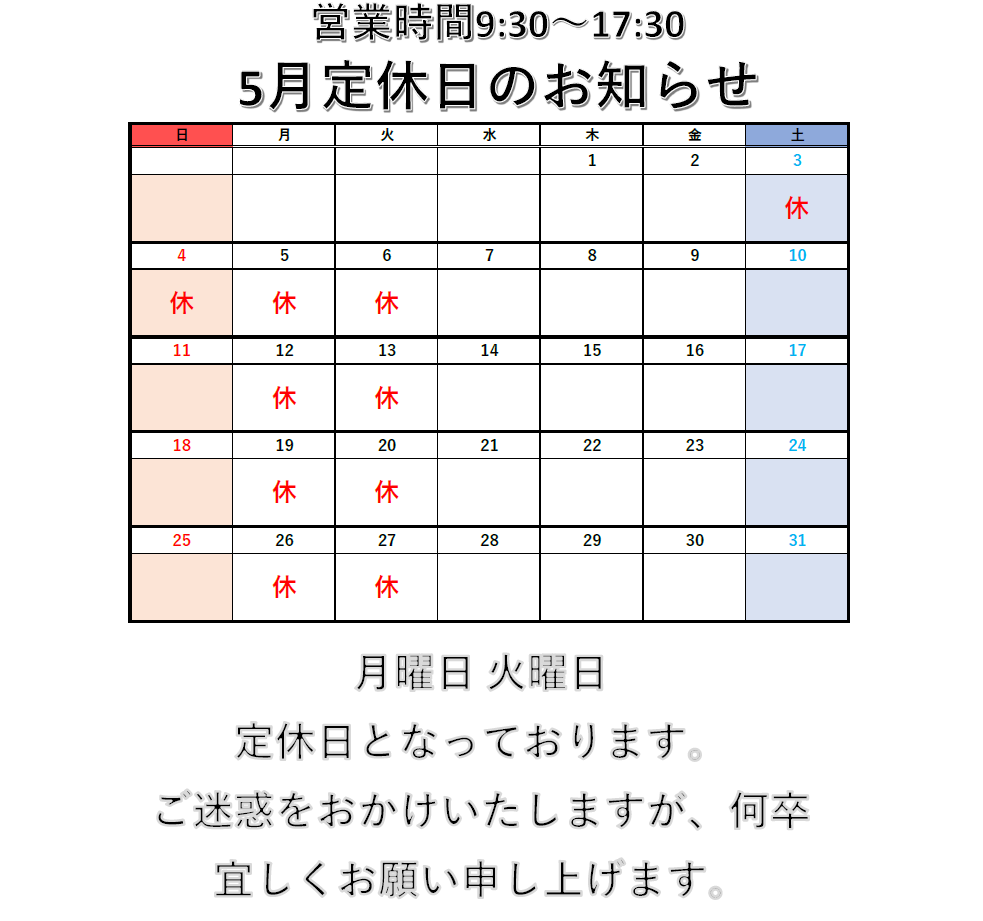いつも当店をご利用いただきありがとうございます。 当店5月の定休日は以下画像の通りとなります
