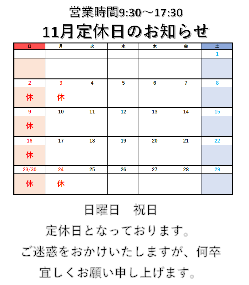 いつも当店をご利用いただきありがとうございます。 当店11月の定休日は以下画像の通りとなります