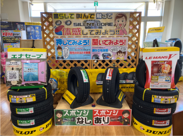 スポンジタイヤを実際に体感できるコーナーも店内にあります!
