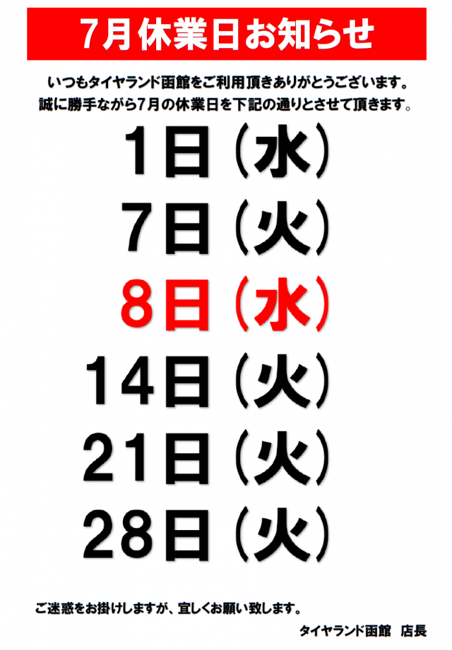 7月定休日のご案内です。