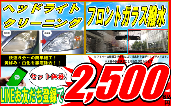 ヘッドライトコーティング、ガラス撥水いつでも承っております!