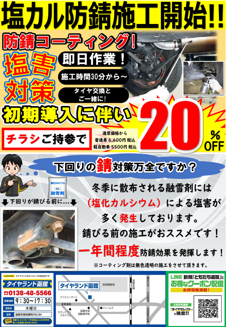 タイヤランドでは、新たに塩カル防錆施工開始!