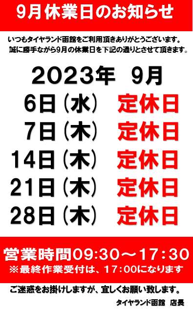 ◆9月定休日のお知らせ