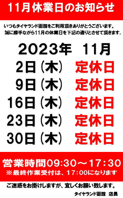 ◆11月定休日のお知らせ