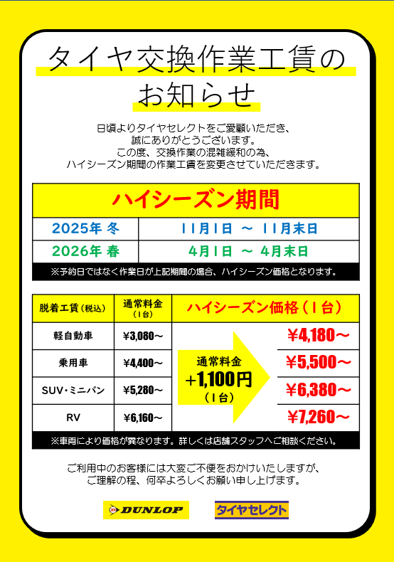 4月、ハイシーズン価格開始! タイヤ交換は早期ご予約を!!