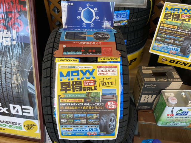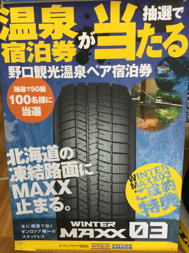 こんにちは、店長の鳥井です。 さて、タイヤランド函館の セールのお知らせです!! 【早得SALE】 WINTER MAXX03を買って 野口観光温泉ペア宿泊券を当てよう!! WINTER MAXX03 4本セッ...