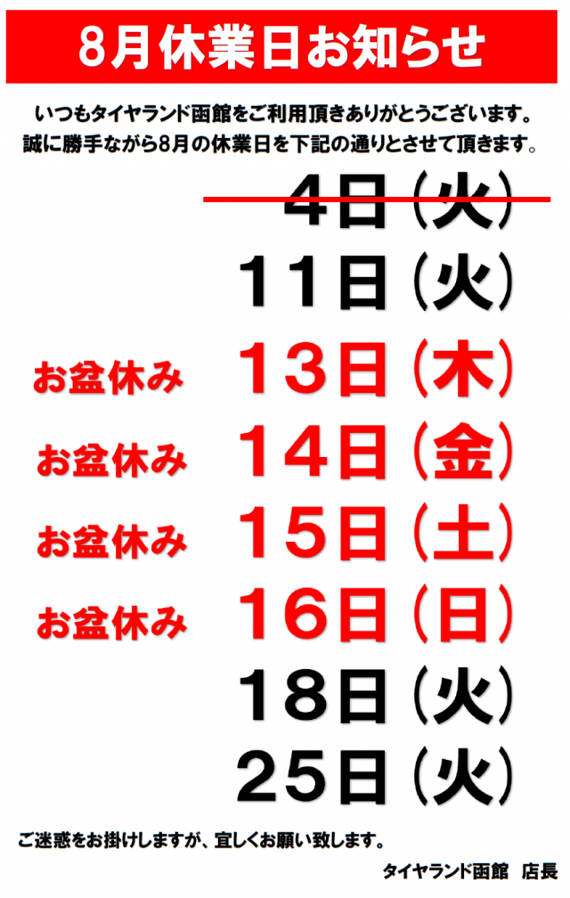 こんにちは、店長の鳥井です。 今日からの連休に入った方も おられるんではないでしょうか? さて、気になるタイヤランド函館の 休業日は・・・ 通常の定休日以外には 13日(木)~16日(日)まで お盆休みを頂い...