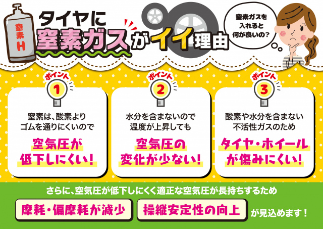 こんにちは、副店長の鳥井です。 みなさん、窒素ガスをご存じですか? 窒素ガスは、 タイヤの中の空気の代わりに充填するガスです。 窒素ガスに変えるとメリットがあります。 1、空気圧が低下しにくい 2、空気圧の変...
