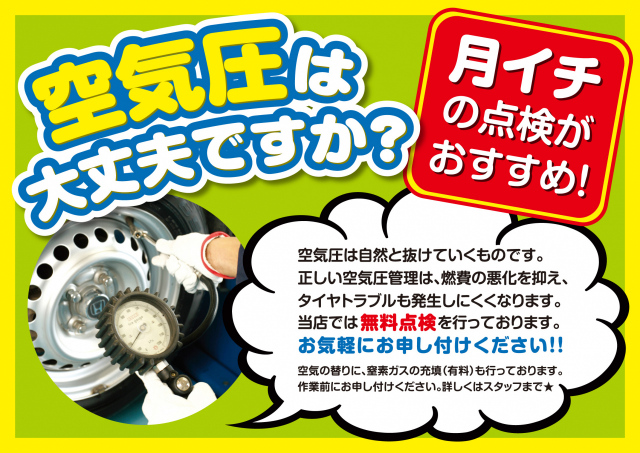こんにちは、副店長の鳥井です。 ところで、みなさんタイヤの空気圧点検は どのくらいのペースで点検してますか? 月に約5%ほど、自然にタイヤのの空気圧は 自然と抜けてしまいます。 そこて、当店では 月1回の空気...