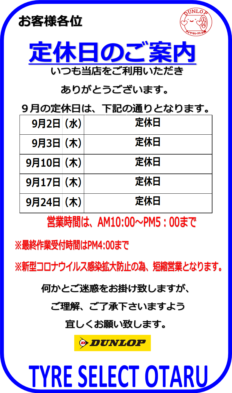 9月定休日のお知らせ いつも当店をご利用いただき誠にありがとうございます。 9月定休日は下記の通りとなります。 お客様にはご不便とご迷惑をおかけいたしますが、何卒宜しくお願い致します。 2020.08.31