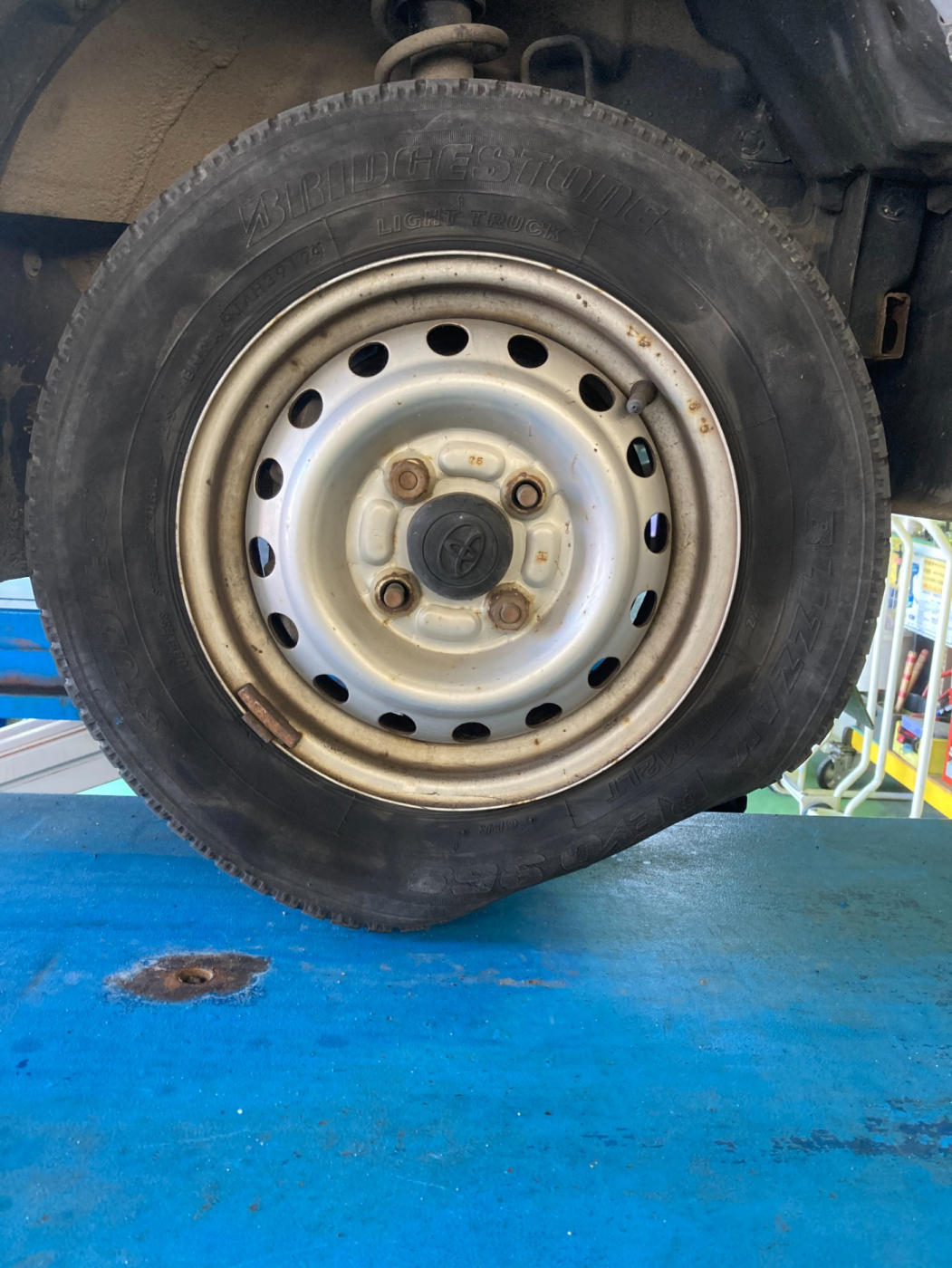 履きつぶしの冬タイヤで溝もほぼない状態。タイヤの年数も10年近く経っており、パンクへ