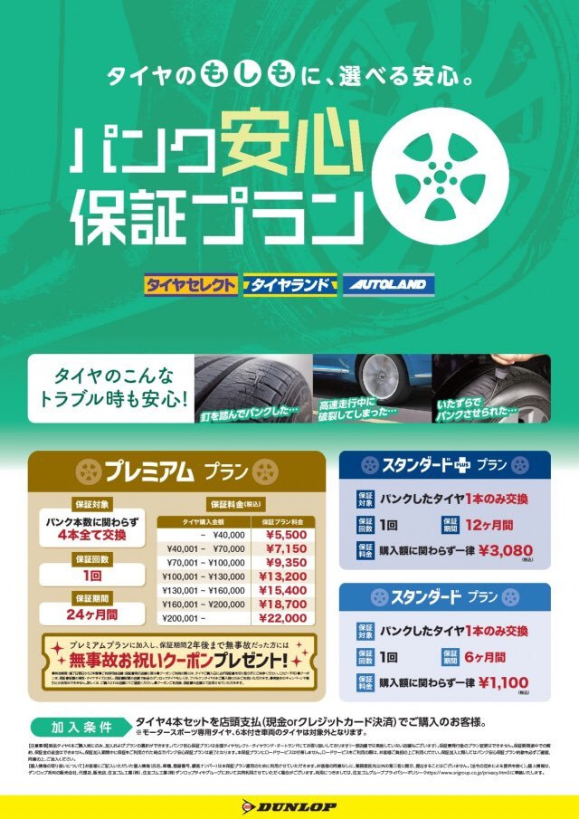 冬タイヤ早期購入受付中! こんにちは! 絶賛セール中です! 早めに冬への備えをしませんか? タイヤ購入の際に、1100円から入れるパンク保証もお付けできます! もしもの時に役立つ安心プランの検討もよろしくお願い致します。 2022.08.02