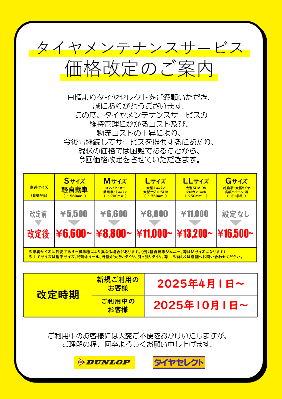 5月12日 タイヤメンテナンスサービス 価格改定の再案内