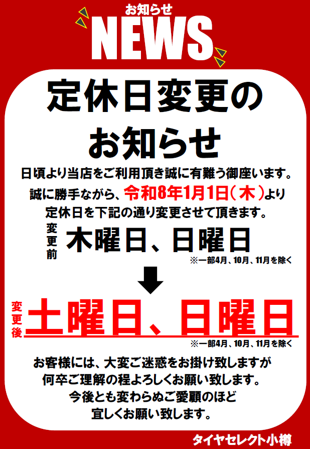 1月より上記の通り定休日が変更となります。