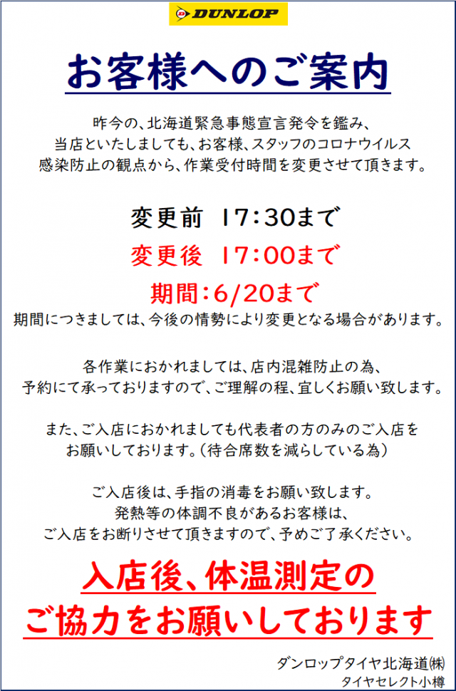 いつも当店をご利用いただき誠にありがとうございます。 タイヤセレクト小樽の島崎です! 先月、緊急事態宣言が発令されてから6月になりましたが、 引き続き6月20日まで緊急事態宣言が延長されましたね(;'&...