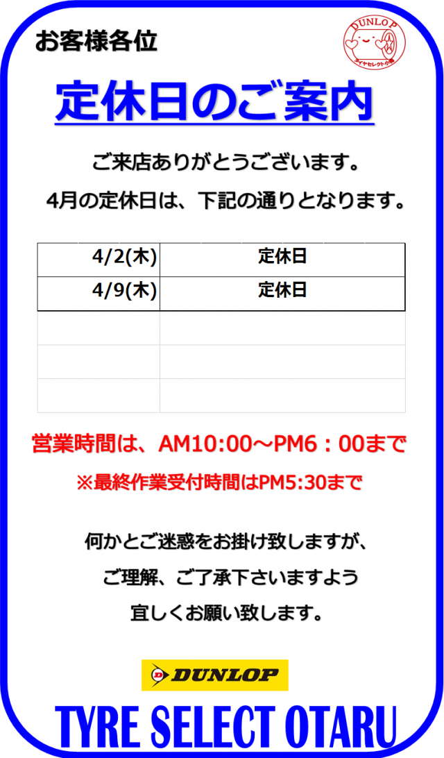 いつも当店をご利用いただき誠にありがとうございます! タイヤセレクト小樽店の井岸です! 4月はタイヤ交換時期の為、少し早めに定休日をご案内いたします。 下記画像の通りとなっております。ご迷惑をお掛けいたし...
