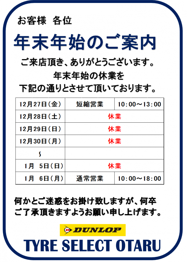 いつも当店をご利用いただき誠にありがとうございます。 タイヤセレクト小樽店です。 年末年始の休業日は以下の通りになります。 お客様にはご迷惑をお掛けいたしますが、何卒よろしくお願いいたします。