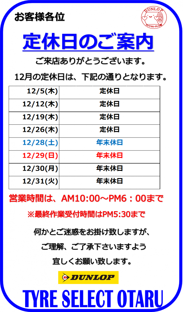 いつも当店をご利用いただき誠にありがとうございます。 タイヤセレクト小樽店の井岸です。 本日28日は木曜定休日となっております。 お客様にはご迷惑をお掛けいたしますが、何卒よろしくお願いいたします。