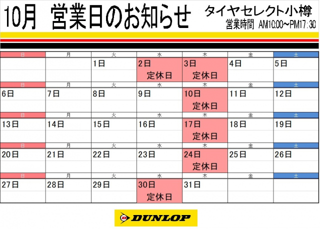当店ホームページをご覧頂き有難う御座います。 10月の定休日のご案内です! また、徐々にタイヤ交換のご予約を頂いており、10月後半は既に、終日ご予約で埋まりそうな日も出てきております!  ...
