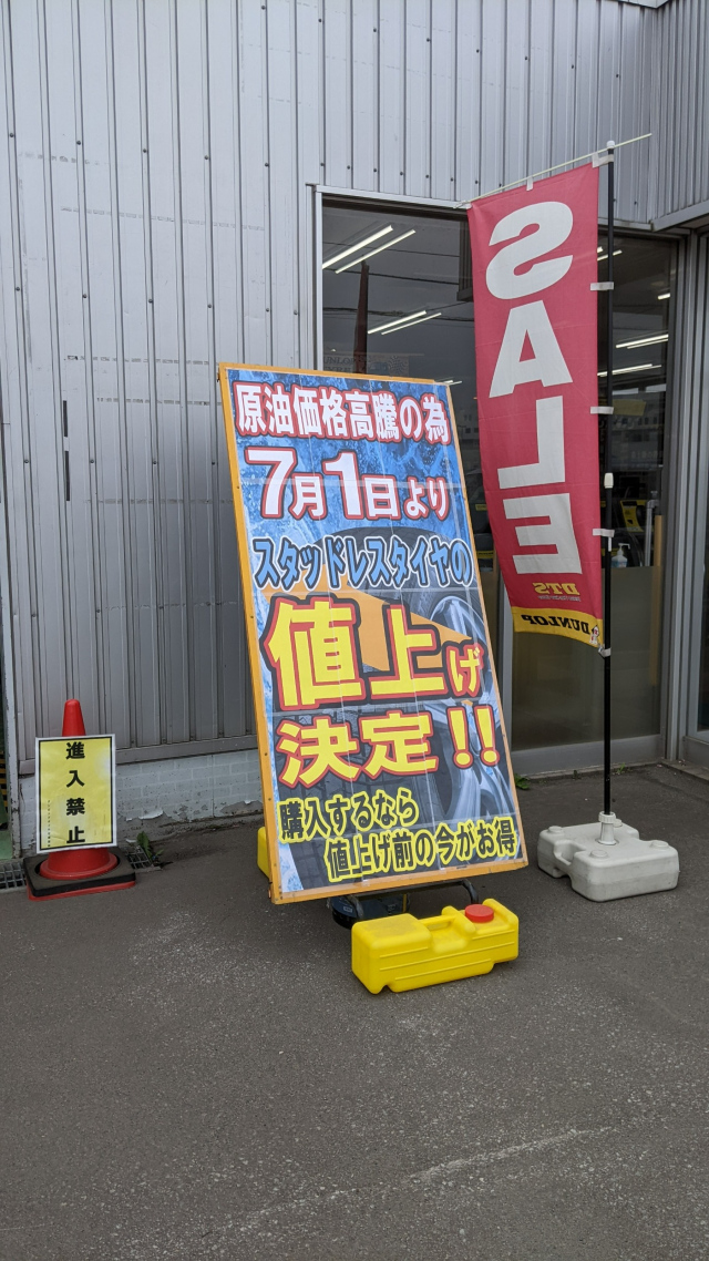 当店ホームページをご覧頂きありがとうございます‼ 本日は皆様に大事なお知らせ‼ 7月1日よりスタッドレスタイヤの値上げが御座います‼ 溝が減っている、ヒビが入っている等等 スタッドレ...