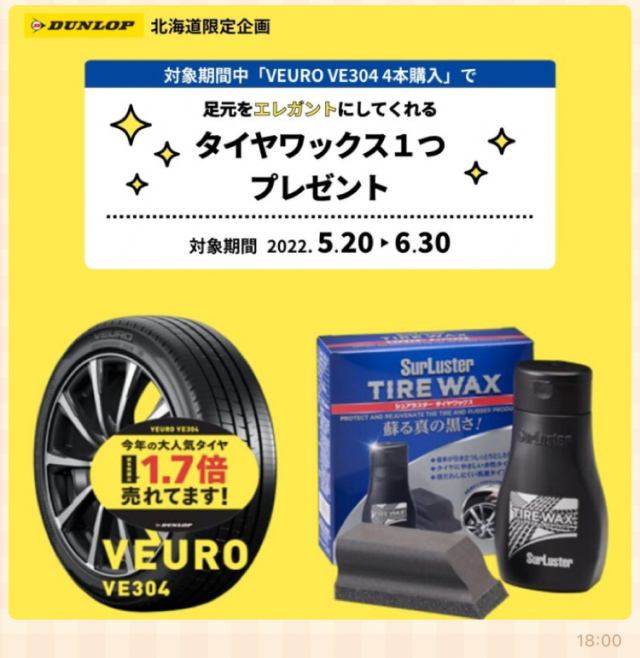 こんにちは! 5/20から6/30日の間限定で、VEURO VE304 4本購入で タイヤワックスプレゼント中です!! ※なくなり次第終了です。 足元をエレガントにしたい方必見です! 皆様のご来店お待ちしております。