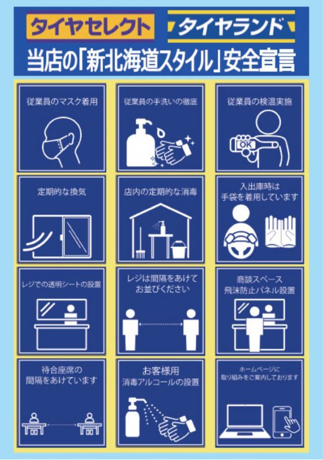 こんにちは! 久々に雪の少ない日で除雪疲れが続いていた日々も一旦お休みですね! さて、タイヤセレクトは「新北海道スタイル」を日々取り入れています! 定期的な消毒、喚気を念入りに行っています。 お客様の滞在時...