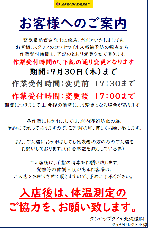 こんにちは! タイヤセレクト小樽の島崎です! 緊急事態宣言が発令され、小樽市も対象となりました。 また、緊急事態宣言が9月末まで延長となりました。 発令に伴って当店の変更点として 最終作業受付時間を17...