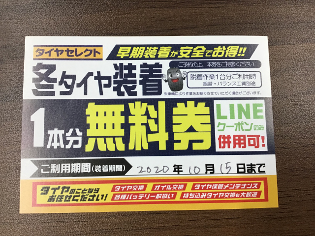 こちらのクーポンのご提示でタイヤ交換工賃が1本分無料になります!!