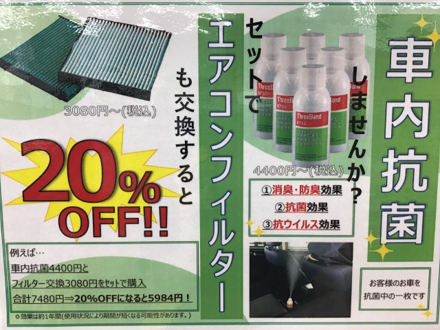 さらに、エアコンフィルターとご一緒に車内抗菌も行うと合計金額から20%引きとお安くなっているので
