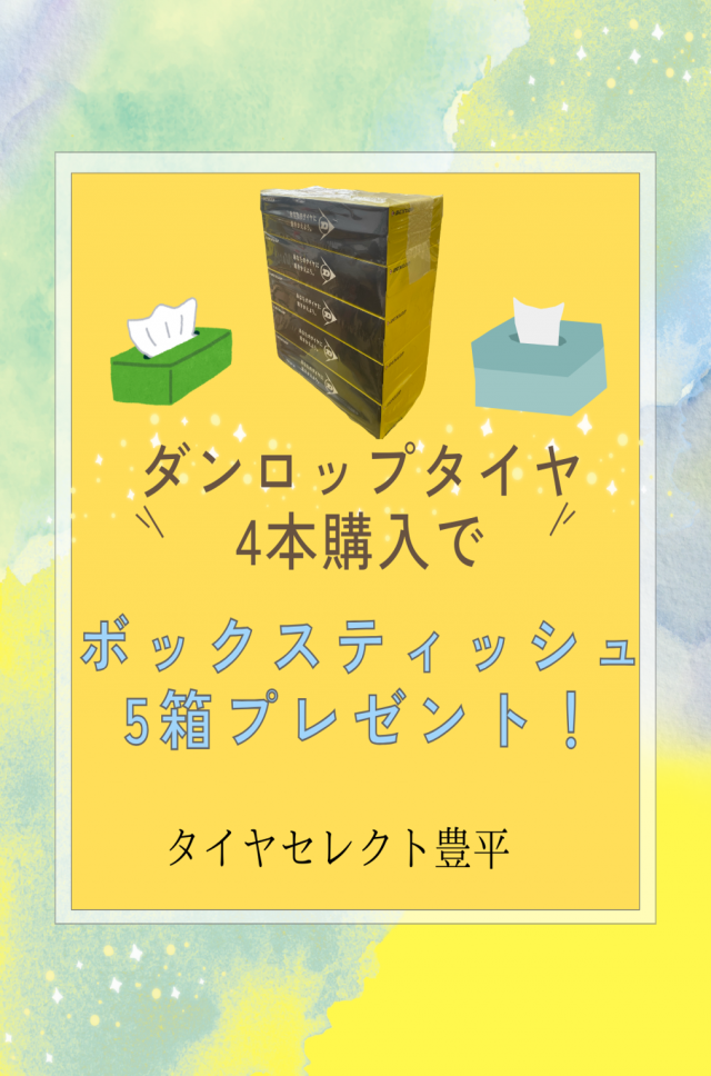 タイヤセレクト豊平スタッフTです!!! 当店ではダンロップタイヤ4本購入で ボックスティッシュ5箱プレゼント!!!! タイヤの点検は無料で行っております(`・ω・´)ゞ 気軽にご来店ください!!! ここ...