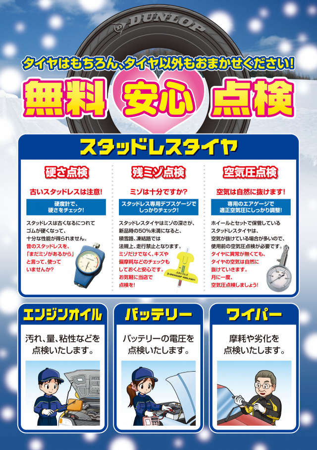 こんにちは、加藤です! 本日は無料点検のご案内です! 当店ではタイヤはもちろんエンジンオイル、バッテリー、ワイパーも同時に無料で点検いたします! すべて車にとってとても大切な箇所なので定期的な点検をお願い...