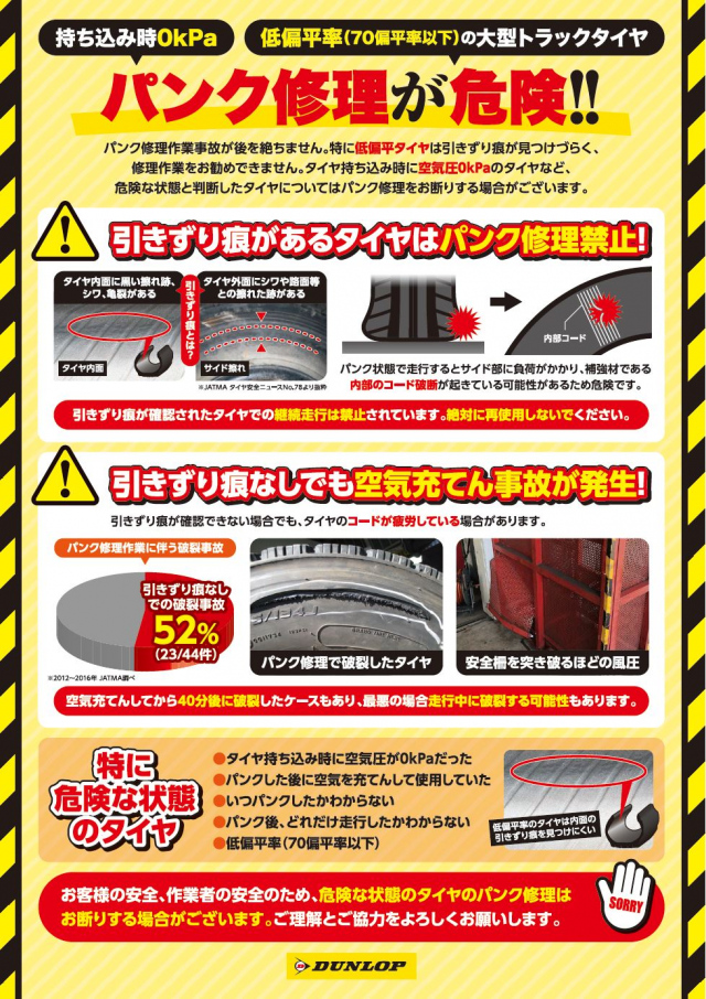 パンクした状態で走行を行うとタイヤ外部の損傷はもちろん