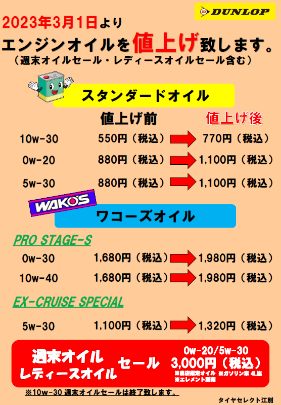 また、週末オイルセール・レディースオイルセールの価格も値上げになります。