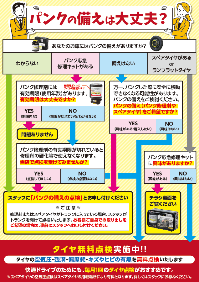※タイヤ応急修理キット使用した場合は、新しくタイヤ購入することが必要です。