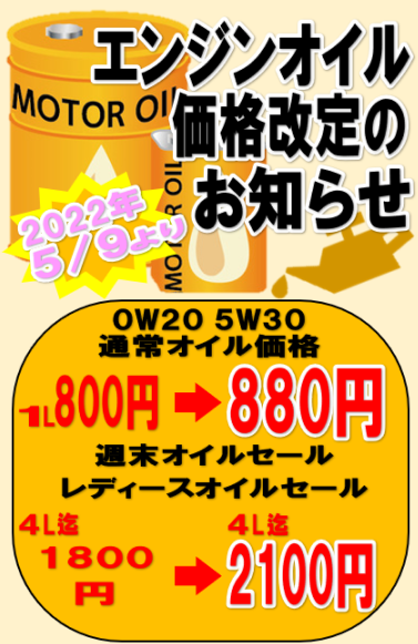 当店ホームページをご覧頂きありがとうございます タイヤアドバイザーの谷口です 皆様に長らくご愛顧頂いておりました、量り売りエンジンオイル 価格改定のご案内となります。 昨今の物価上昇に伴い当店...