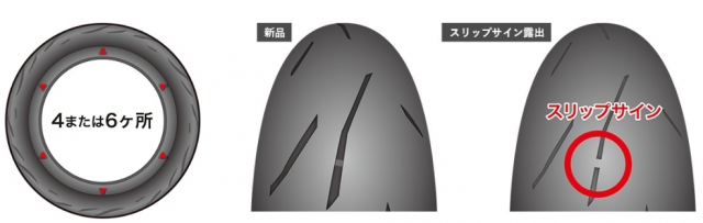 2輪自動車用タイヤにはトレッド全周4 ヵ所または6ヵ所、