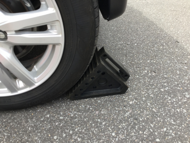 ④安全の為、お車のタイヤに輪止めを設置致します!
