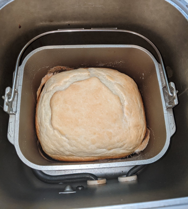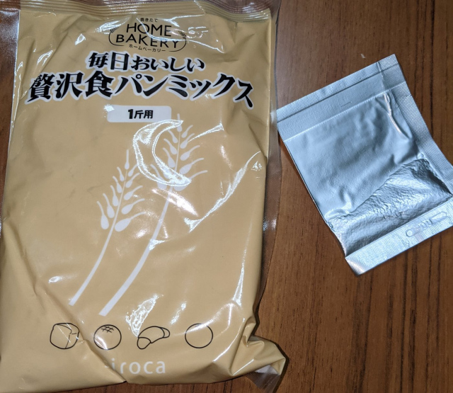 下の写真の謎の粉と水をパン焼き機に入れて2時間待ち。。。
