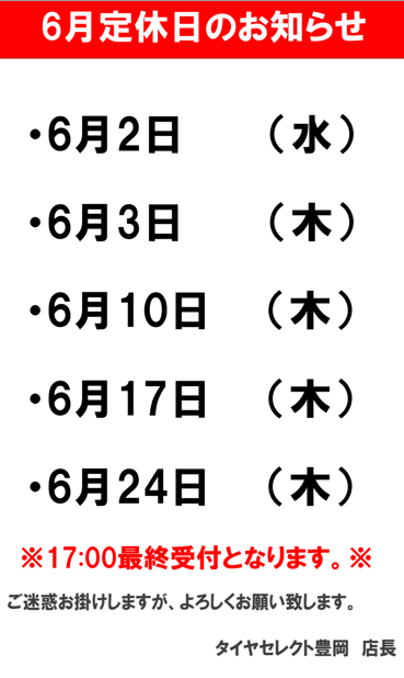 6月の定休日のご案内。