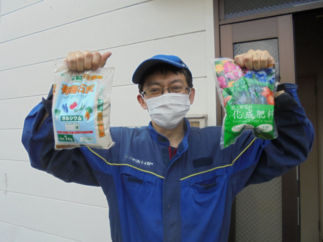 園芸担当!?の佐藤さんが肥料と石灰を持ってきてくださり