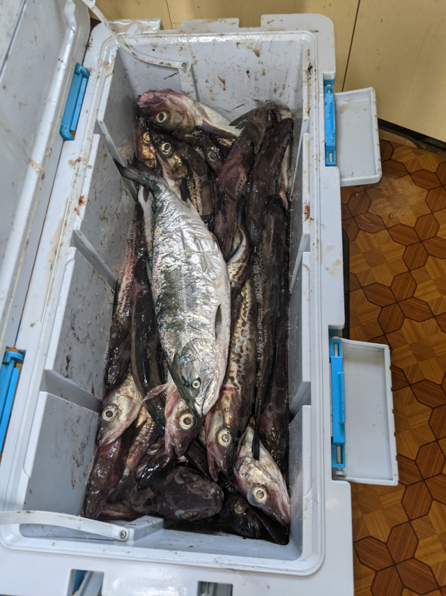 先月、虎杖浜で取れたマスとスケソウダラ。