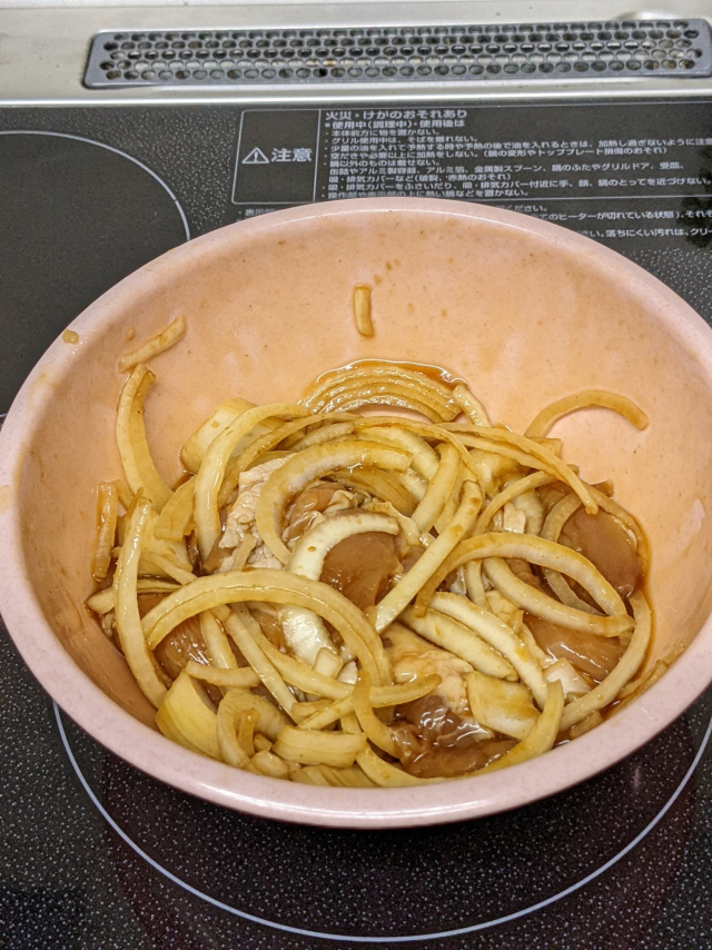 鶏モモ肉と玉ねぎを、自家製タレで漬け込んで、、、
