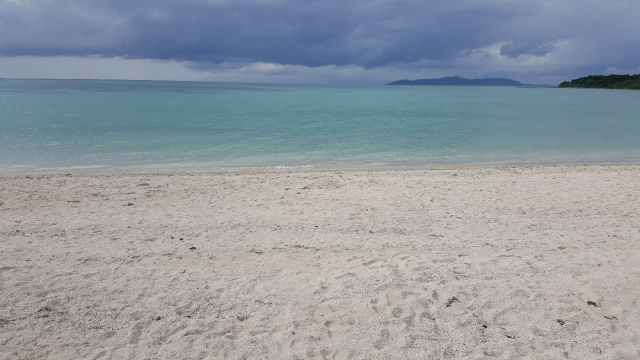 曇り空にもかかわらず、マリンブルーと白浜のコントラストが