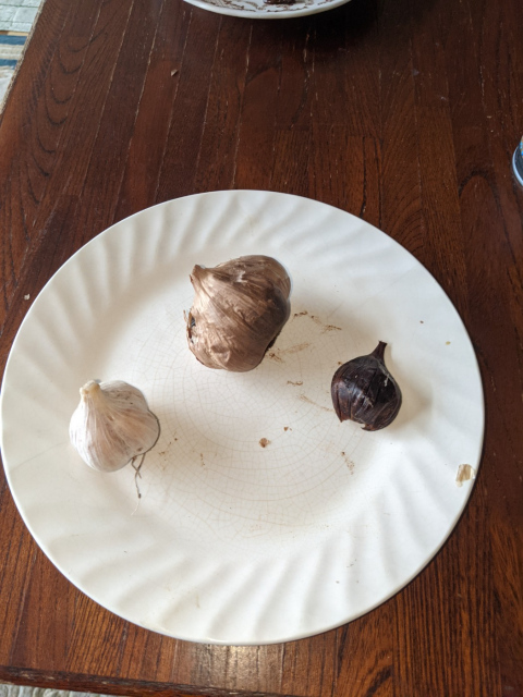 左は生ニンニク、右が剥いた黒ニンニクになります。
