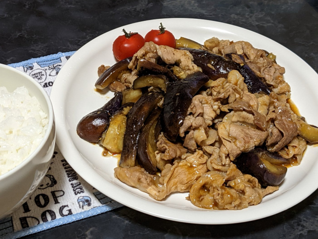 「ナスと豚バラの辛味噌炒め」に~