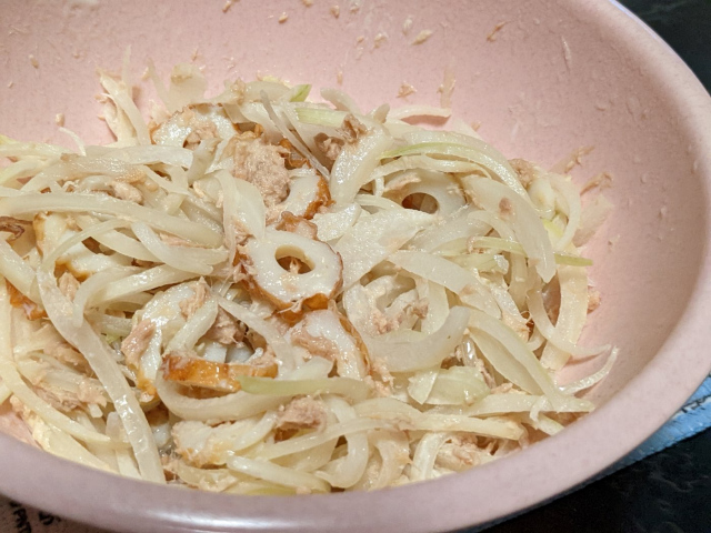 「オニオンスライスとちくわのツナマヨサラダ」に~