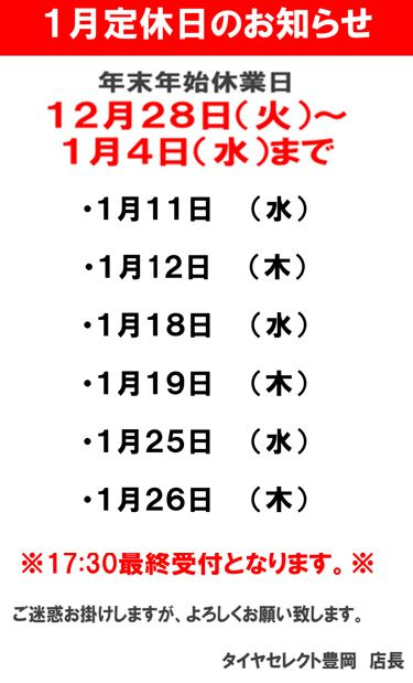1月定休日のご案内